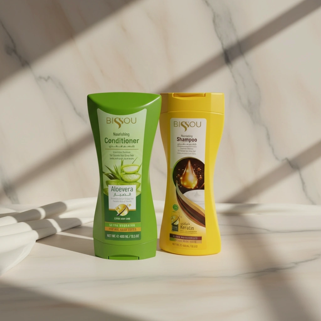 شامبو كيراتين وبلسم ألوفيرا يغذي الشعر، يقويه، ويرطّبه لنعومة ولمعان فوري.